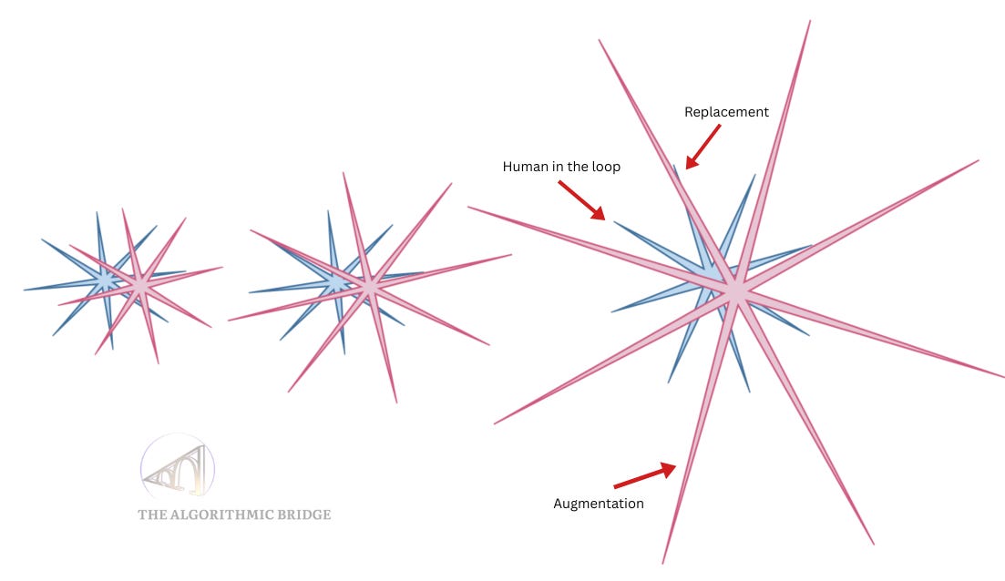 8. Replacement (AI can do what we do, e.g., boilerplate code), augmentation (AI does what we are bad at, e.g., fast arithmetics), and “human in the loop” (we do what we AI is bad at, e.g., tacit know-how tasks in the real world) scenarios are not mutually exclusive: thanks to the jagged nature of AI, all three will happen simultaneously (I explored this idea in The Shape of Artificial Intelligence). Here’s a symbolic visualization (the blue star covers the territory of human capability, the pink one, the territory of AI’s capability):