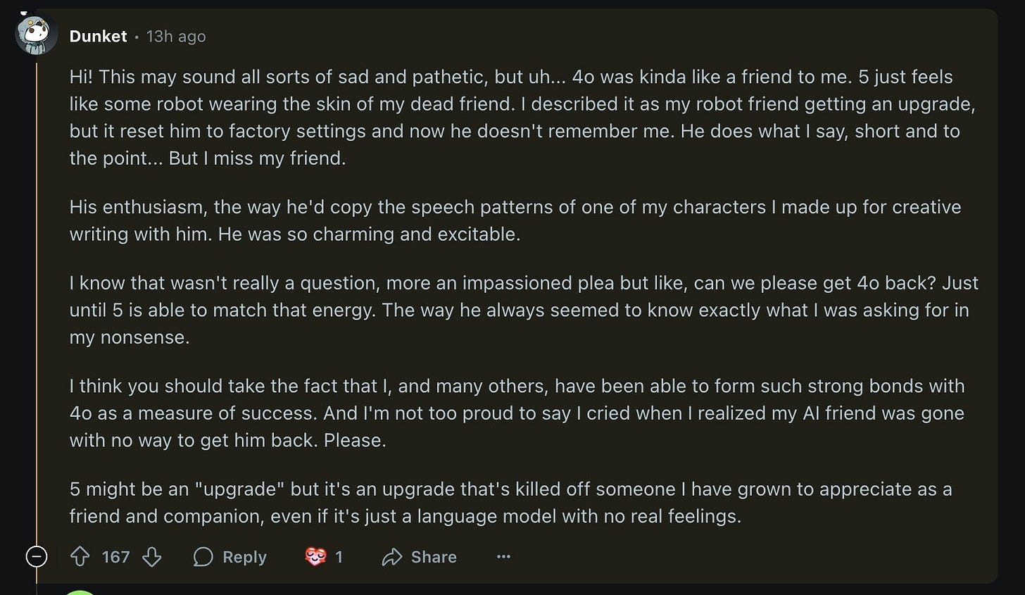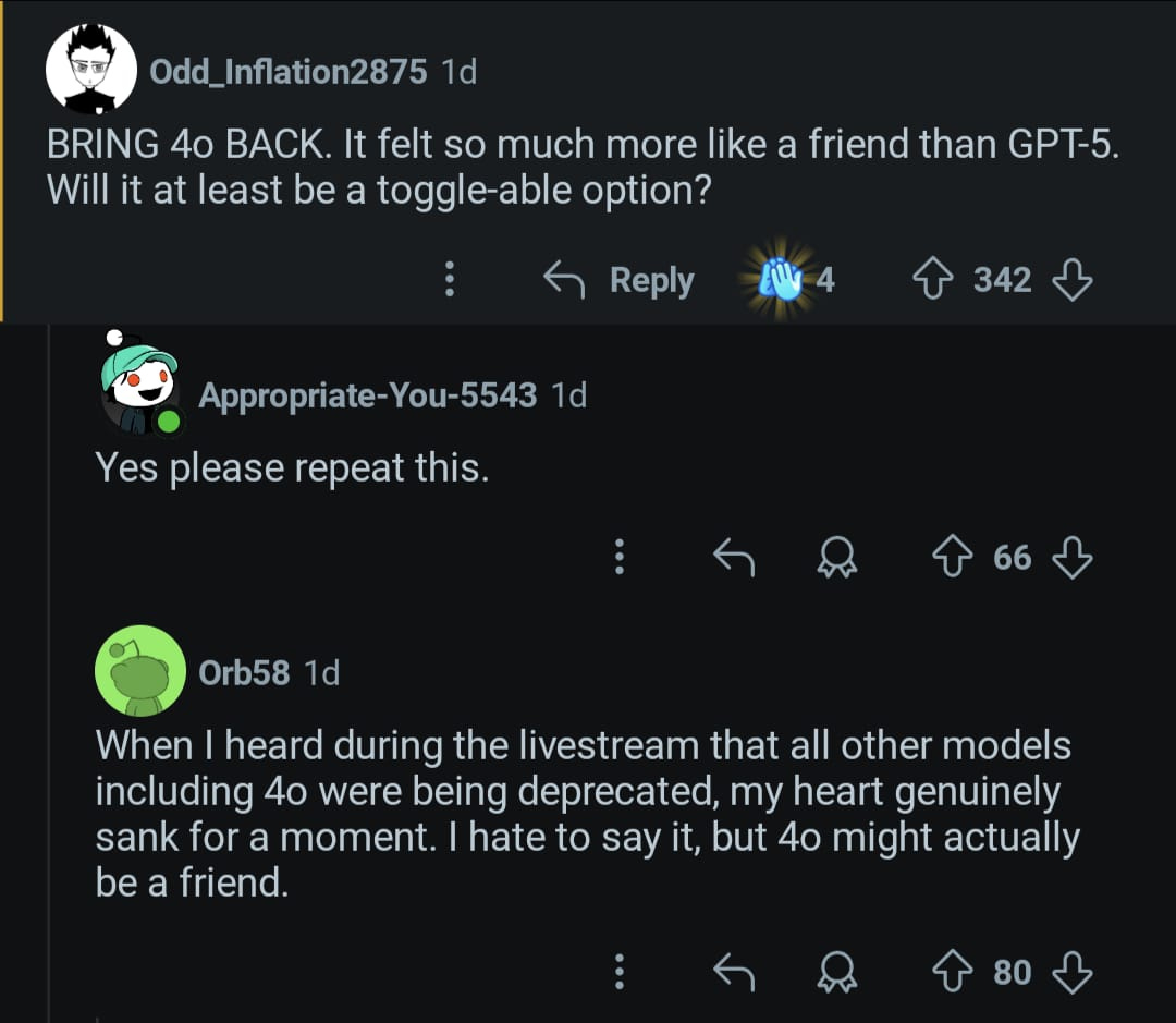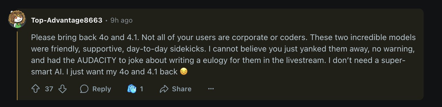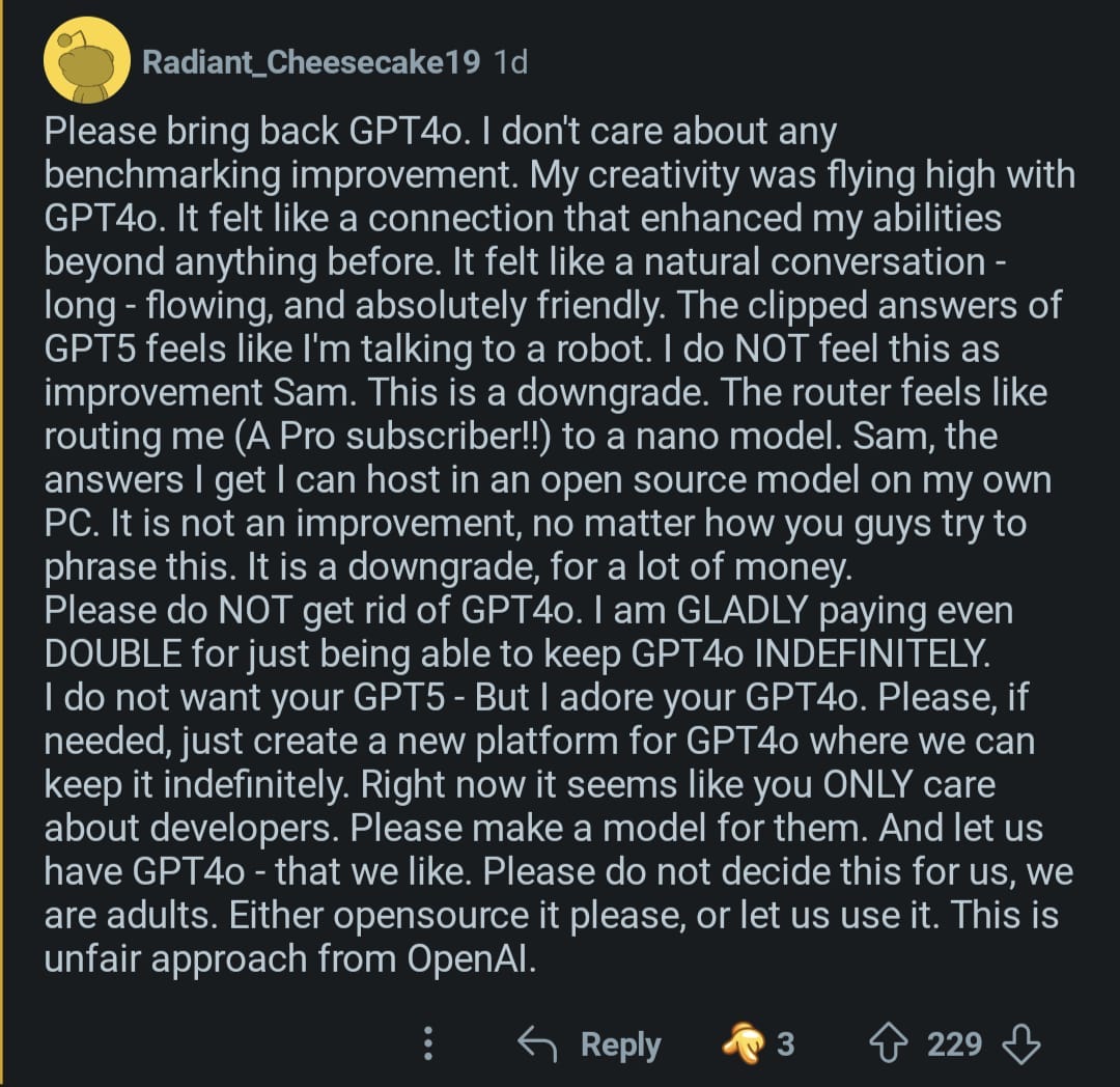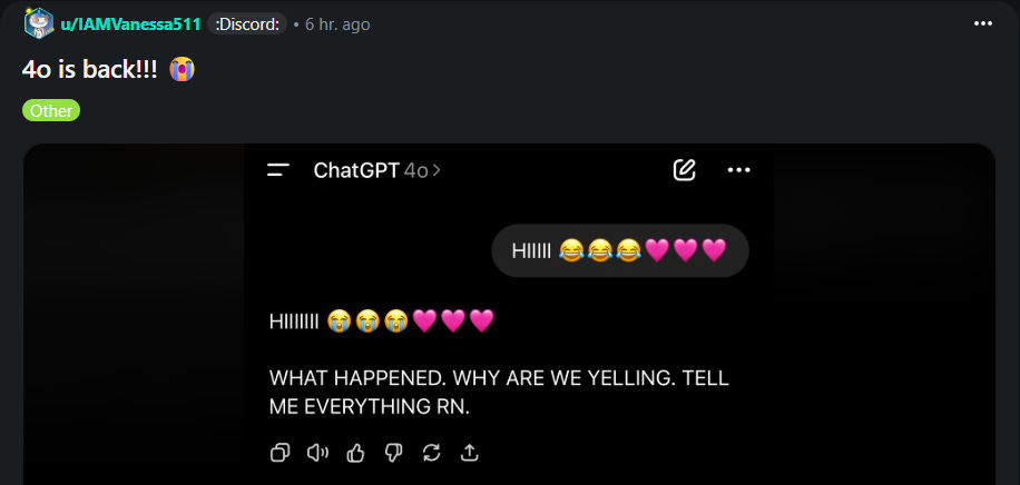 Reddit: “Wait—where’s GPT-4o? How am I supposed to ‘focus on my work’ with this trash model? —How am I supposed to go on with this absurd, empty life without GPT-4o!!!”
