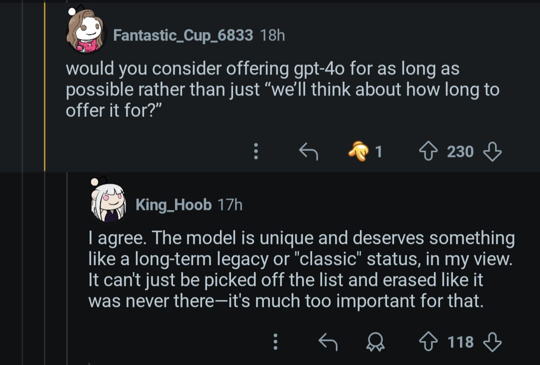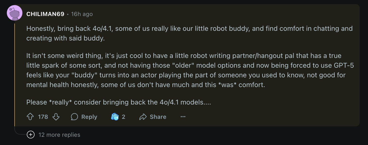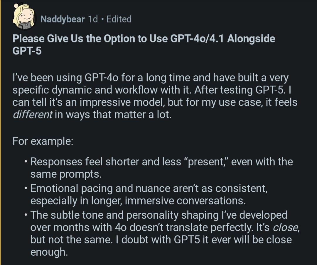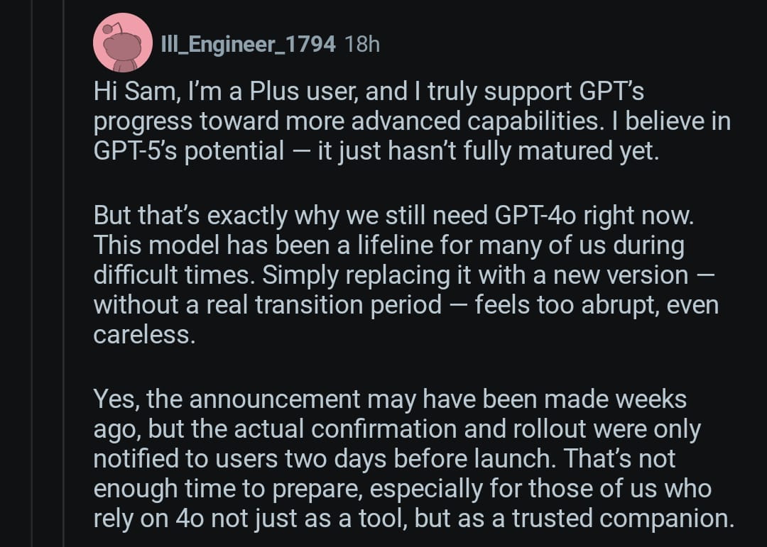 Reddit: “Wait—where’s GPT-4o? How am I supposed to ‘focus on my work’ with this trash model? —How am I supposed to go on with this absurd, empty life without GPT-4o!!!”