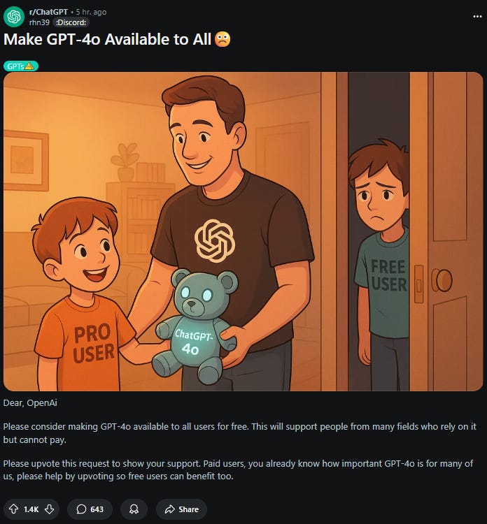 Let’s parse Altman’s tweet before analyzing Reddit’s reaction. The first part (“We will let Plus users choose to continue to use 4o”) reveals they can't afford to lose user revenue (remember, they’re running at a loss despite the constant growth in paying users; besides, they have a country to rebuild). It also means that people want to use worse models or OpenAI wouldn’t fold (which makes me realize that most people care neither about the ceiling of capabilities rising—that’s for the AGI evangelists—nor the floor of capabilities rising—which I care about—but about the walls being full of candy!).