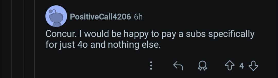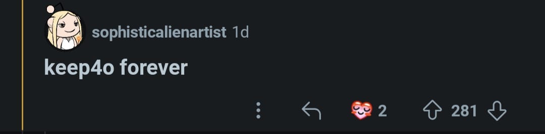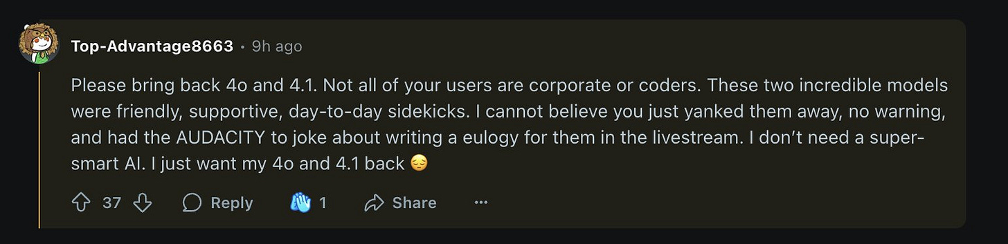 Not long after, he tweeted, among other updates: “We will let Plus users choose to continue to use 4o. We will watch usage as we think about how long to offer legacy models for.” This means those paying at least $20/month (i.e., 2-3% of the total user base). The positive reaction was immediate, which reveals that Reddit users pay for ChatGPT and also that their dependence on it is genuine (some users noted Altman’s “for how long” qualification and pushed back further). Look: