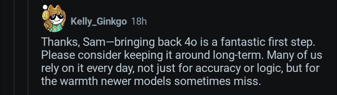 Having witnessed the reaction to losing and then getting back GPT-4o, I think it’s important to consider why people want that. I imagine part of the reason is that GPT-5, as the imposed replacement to 4o, was genuinely malfunctioning yesterday (was the auto-switch broken, or working as intended, which simply happens to be in a suboptimal way?). But another part is, obviously, its personality: 4o is a friend, a companion, a lover; some want it to live forever, some need it to live themselves. People just love the sycophantic personality. Two things I’ve written elsewhere reflect my takeaway on this (the first is from July 3rd, and the second from April 29th; the reverse chronological order is intentional):