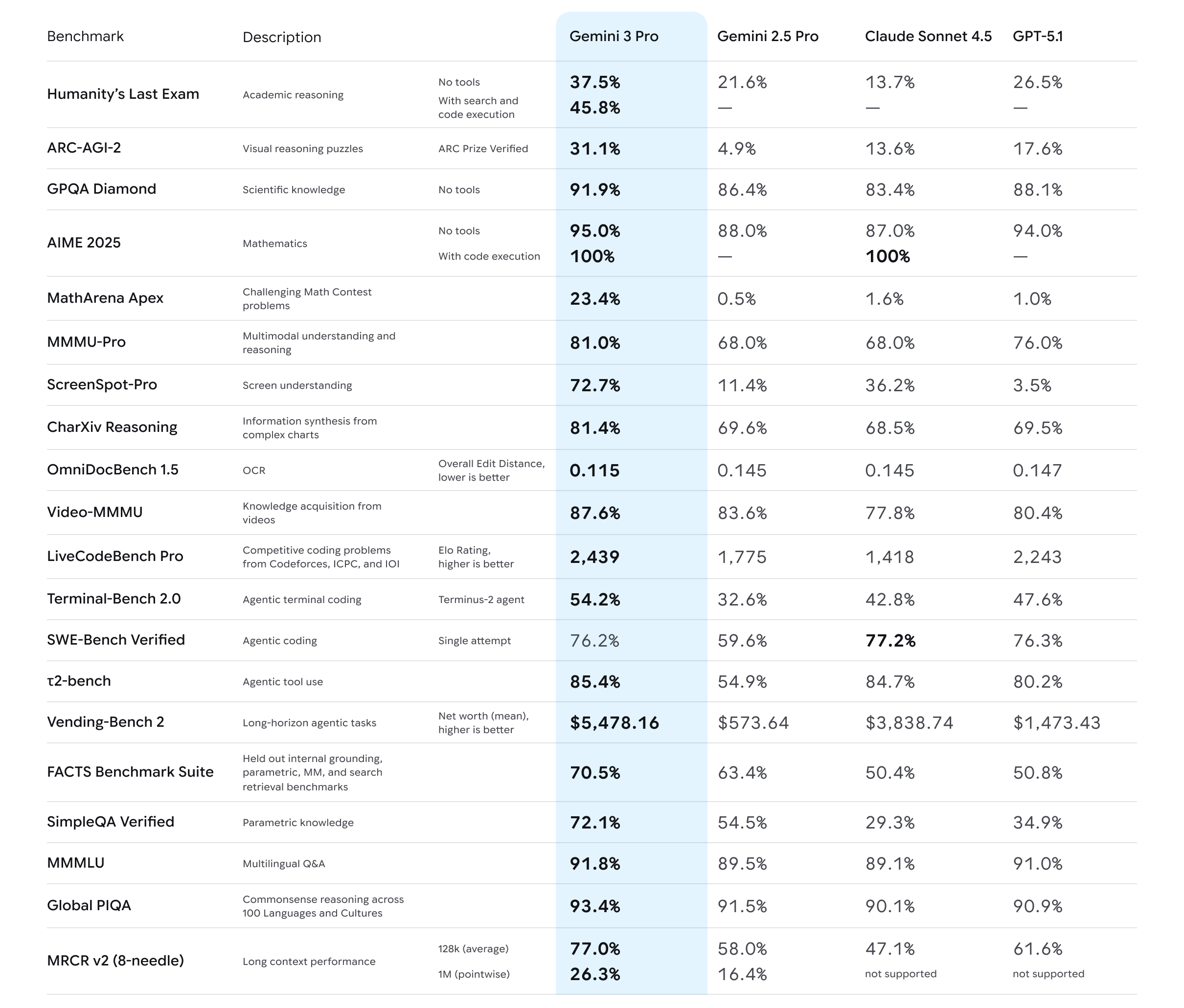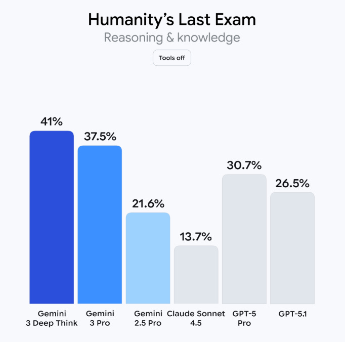 Gemini 3 Pro achieved an 11 percentage-point jump on Humanity’s Last Exam (a benchmark consisting of “2,500 challenging questions across over a hundred subjects”), up to 37.5% from GPT-5.1’s 26.5%.