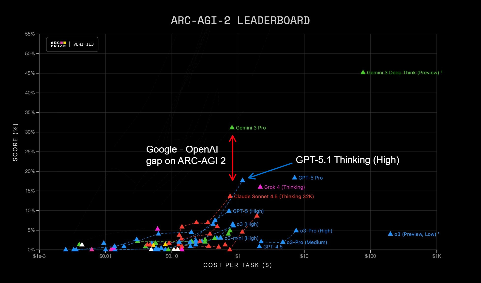 Mike Knoop, co-founder of ARC Prize, said that “We’re also starting to see the efficiency frontier approaching humans.” Gemini 3 Pro, at its fastest, is nearing the average speed of humans, which is surprising because we operate visually on ARC-AGI, whereas AI models use tokens as they normally would.