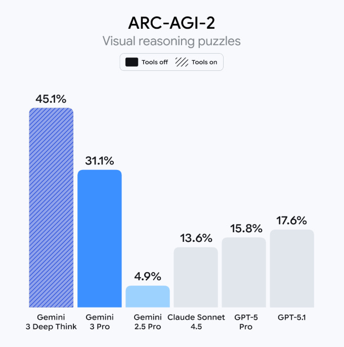 Don’t confuse this gap with the usual new-model-is-better jump in capabilities: look at the level of clustering among the other models; there are years of progress piled up between 0% and 15%. And then, there comes Google, reaching 45%. That’s just crazy; you don’t see a 3x leap in percentage points in an AI benchmark these days.