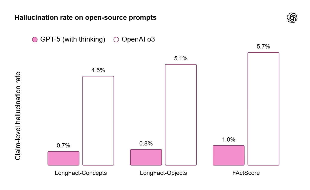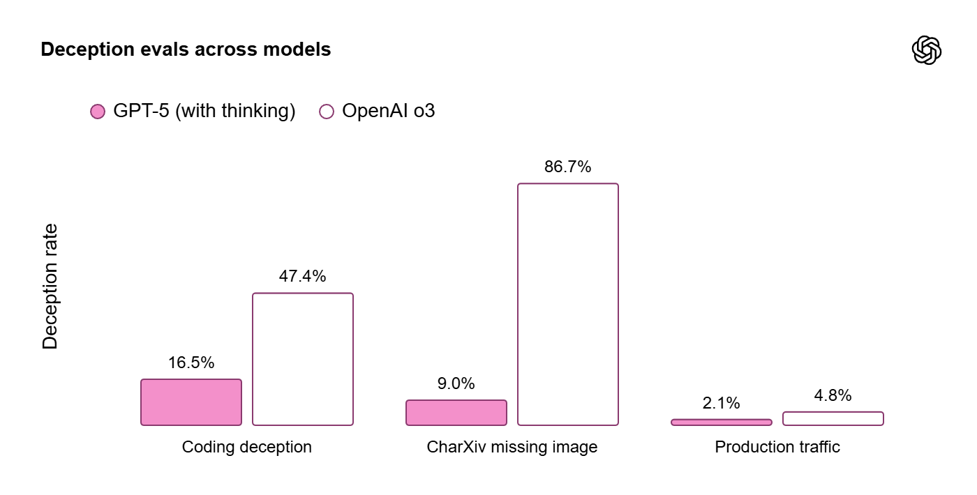 That’s it. It’s what you get from checking the sources I checked (which is, all of them). However, there’s one more thing that no one emphasized—which is also a win for OpenAI—and this one thing is what I consider the most important improvement GPT-5 brings: a huge reduction in hallucination and deception rates.