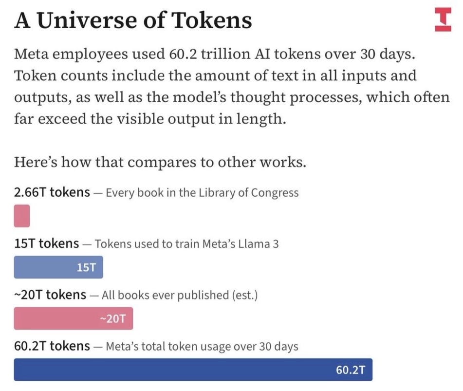 Meta employees have an internal leaderboard called “Claudeonomics.” The ranks go up from casual user to “Session Immortal” to the top tier: “Token Legend.” Setting aside the cringe, it’s crazy that over a 30-day period, total usage on the dashboard topped ~60 trillion tokens (words). For context, it has been estimated that all books published throughout history amount to ~20 trillion tokens.