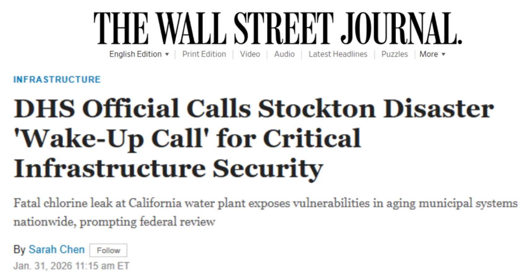 The New York Times has run “California Water Plant Leak Kills Two, Dozens Hospitalized” on the front page of the afternoon edition. The Wall Street Journal has quoted a DHS official who called it “a wake-up call” for critical infrastructure security.
