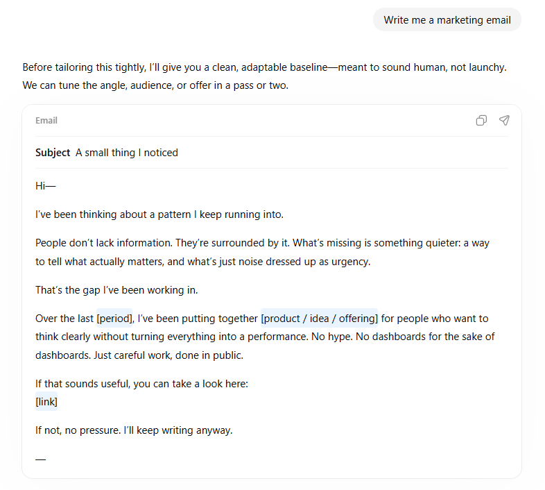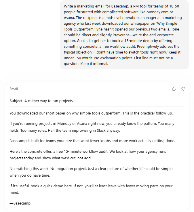 Even better prompt: “Write a marketing email for Basecamp, a PM tool for teams of 10-50 people frustrated with complicated software like Monday.com or Asana. The recipient is a mid-level operations manager at a marketing agency who last week downloaded our whitepaper on ‘Why Simple Tools Outperform.’ She hasn’t opened our previous two emails. Tone should be direct and slightly irreverent—we’re the anti-corporate option. Goal is to get her to book a 15-minute demo by offering something concrete: a free workflow audit. Preemptively address the typical objection: ‘I don’t have time to switch tools right now.’ Keep it under 150 words. No exclamation points. First line must not be a question. Keep it informal.”