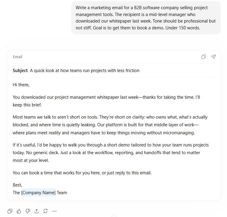 Better prompt: “Write a marketing email for a B2B software company selling project management tools. The recipient is a mid-level manager who downloaded our whitepaper last week. Tone should be professional but not stiff. Goal is to get them to book a demo. Under 150 words.”
