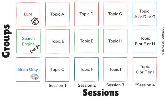 Cross-sectional study: The authors observed three groups in four sessions, but didn’t conduct a longer follow-up to assess the long-term impact. A longitudinal study (measured over long periods) would provide adequate information as to whether the effect of using LLMs is temporary or permanent.