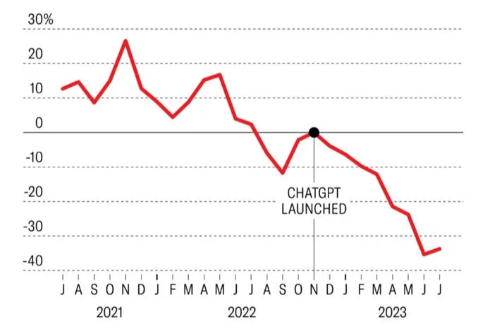 In creative fields, a study on Upwork and Fiverr found that writers, graphic designers, and translators saw job postings drop 21% for “automation-prone jobs” within eight months of ChatGPT’s release, with image-related work declining 17% after DALL-E and Midjourney launched in 2022 and writing-specific jobs plummeting by over 30%. Earnings followed the same pattern: writers lost 5.2% of their monthly income; image workers, 9.4%.