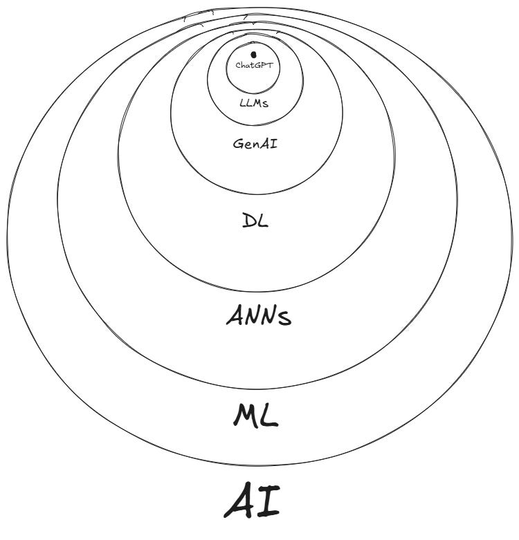 Ok, so that was easier than I thought: the AI field is basically a bunch of nested circles, not even a Venn diagram in the strict sense because none of them intersect with one another. So we have that artificial intelligence contains machine learning, contains artificial neural networks, contains deep learning, contains generative AI, contains large language models, contains ChatGPT. Or, in mathematical notation (quote-ready): AI ⊃ ML ⊃ ANNs ⊃ DL ⊃ GenAI ⊃ LLMs ⊃ ChatGPT. (Show this to your friends, and they will think you’re either 1) an intellectual genius or 2) an insufferable nerd.)