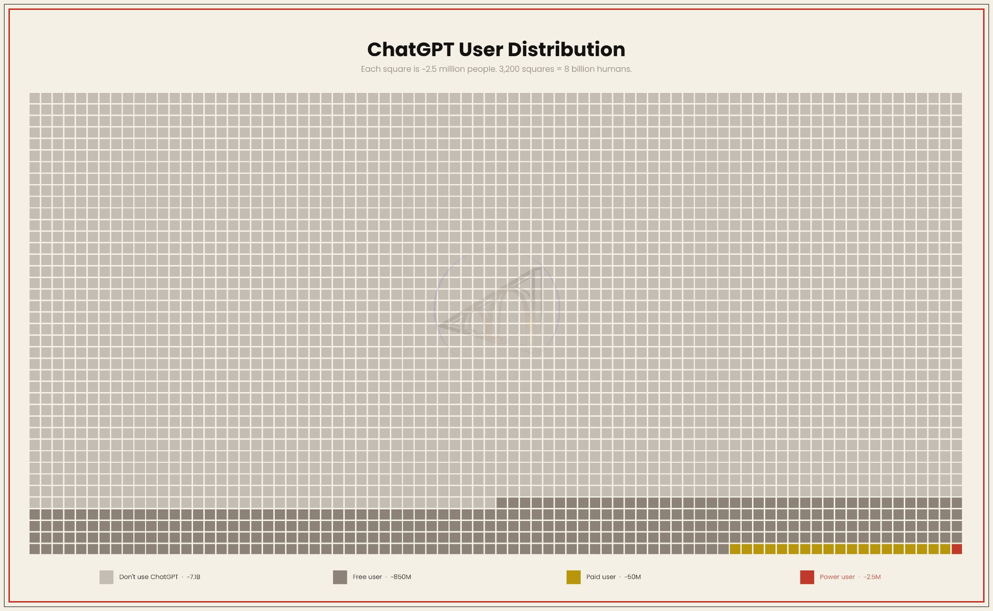 I don’t know what this means for OpenAI’s financials (although the decision to run ads presumably answers that question), but I know what it means for the world: the AI-rich and the AI-poor have become a reality sooner than I thought, and the chasm is way more severe. This is what that looks like: 1) a curve measuring usage as a function of the user ranking and 2) a grid representing the entire world population, the entire ChatGPT userbase, and the power users.