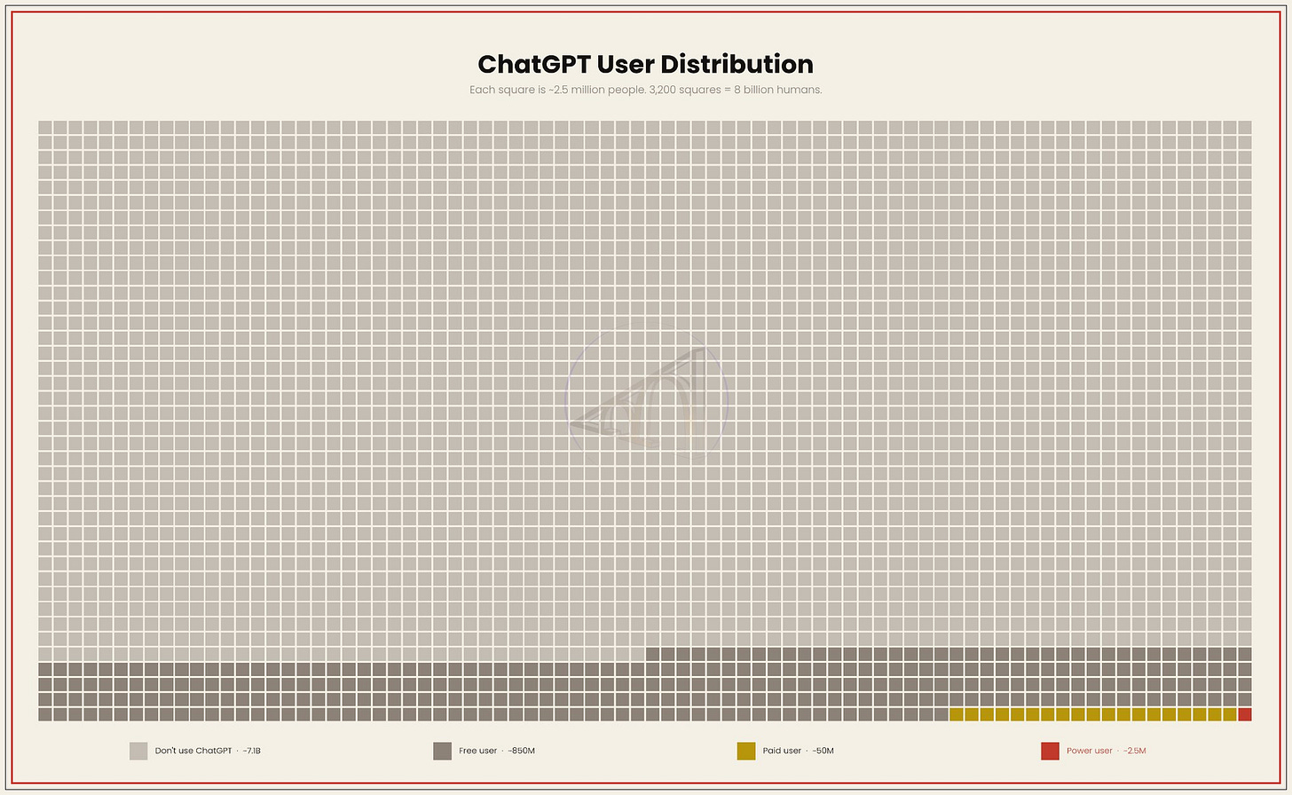 But before attributing responsibility and analyzing the implications of this bipolar reality, let me reiterate the chart’s implications: power users use AI’s most powerful features 7x the median-paying user! (When someone mentions the median, what always comes to mind is a dumbfounded: “Half are below that?”) Let’s break this down further. ChatGPT had around 800 million weekly active users in June 2025; it’s around the 900 million mark right now (up or down a few million due to the exodus to Claude), and I bet that by mid-2026, it will be over 1 billion users (yes, despite QuitGPT).