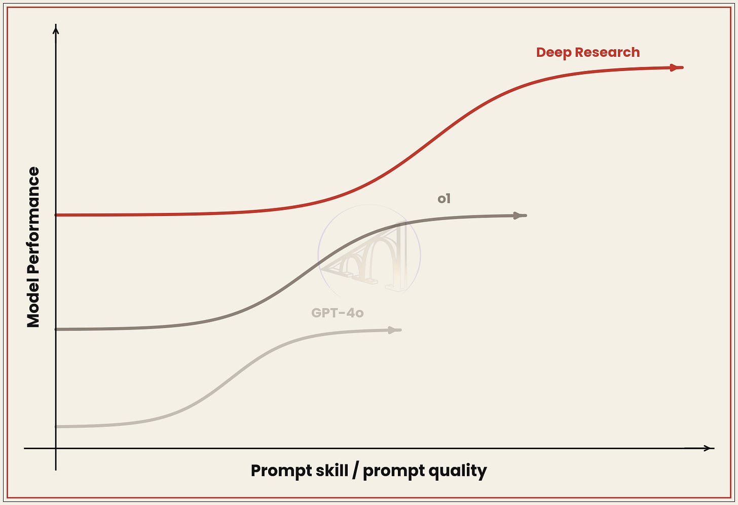 Around this date last year, I wrote an article I’m quite proud of, which I titled *AGI Is Already Here—It’s Just Not Evenly Distributed.* The basic idea is that there’s a huge gap separating casual users from power users that stretches all the way from innovation to diffusion, to adoption, and finally to competence and mastery. Last year, it was a hypothesis; today it’s empirical data. I made the chart below to represent how prompt quality influences model performance. (Although the other two measure usage numbers, quantity and quality are interrelated in people at the top.)