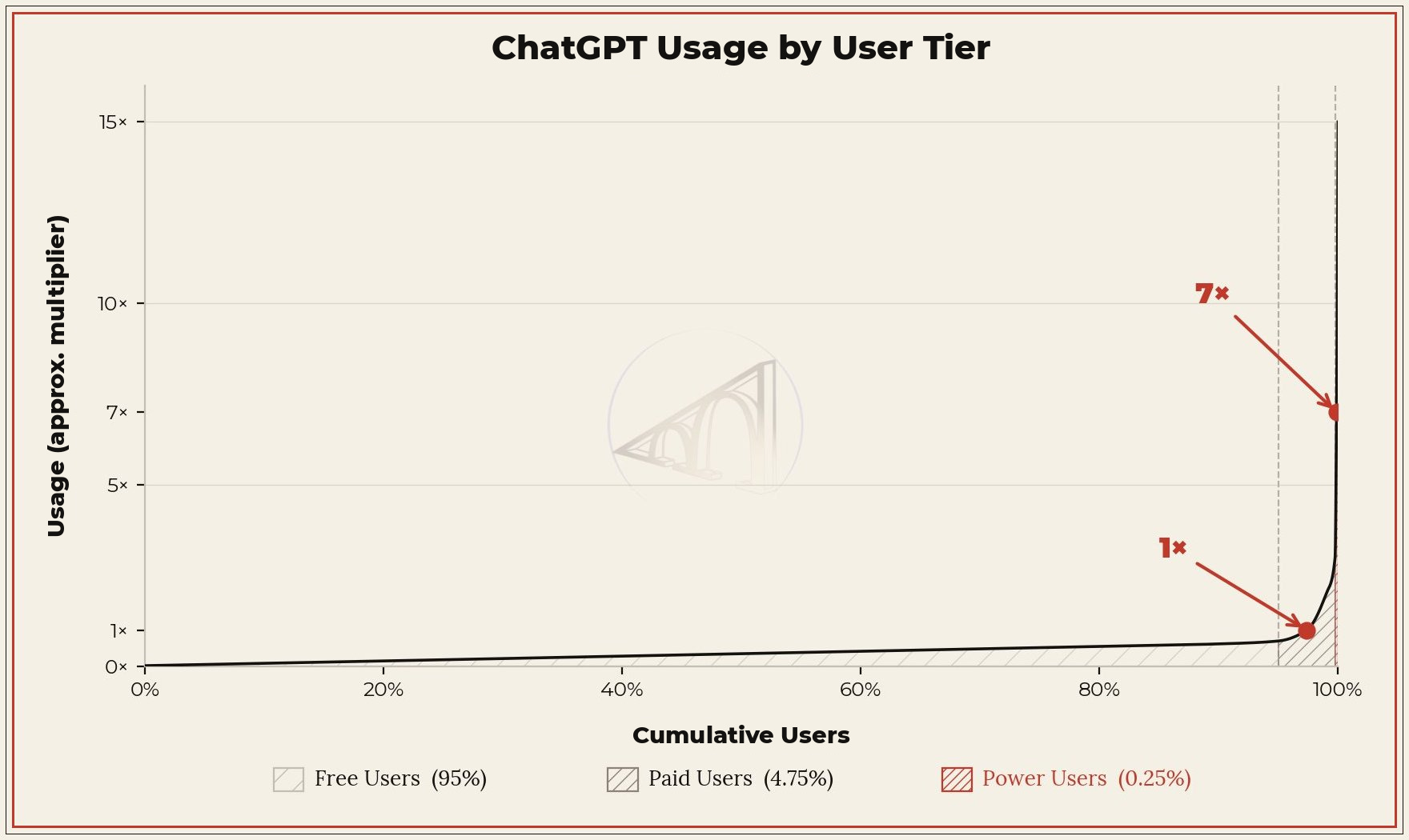 50 million people are paying (slightly above 5% of total users). But then again, the 5% who use it most (power users) among those 50 million are getting 7x more use than the median, which means that the 5% of the 5%—”only” 2.5 million people!—are, right now, getting superhuman performance out of AI agents, whereas the rest are, at best, using ChatGPT as a friend or as an Excel replacement and, at worst, stuck at psychosis, 9.11>9.9, and water-wasting. To put it the other way around: 99.75% of people who are already ChatGPT users use it so little compared to those who are getting real value out of it that their usage numbers are virtually negligible.