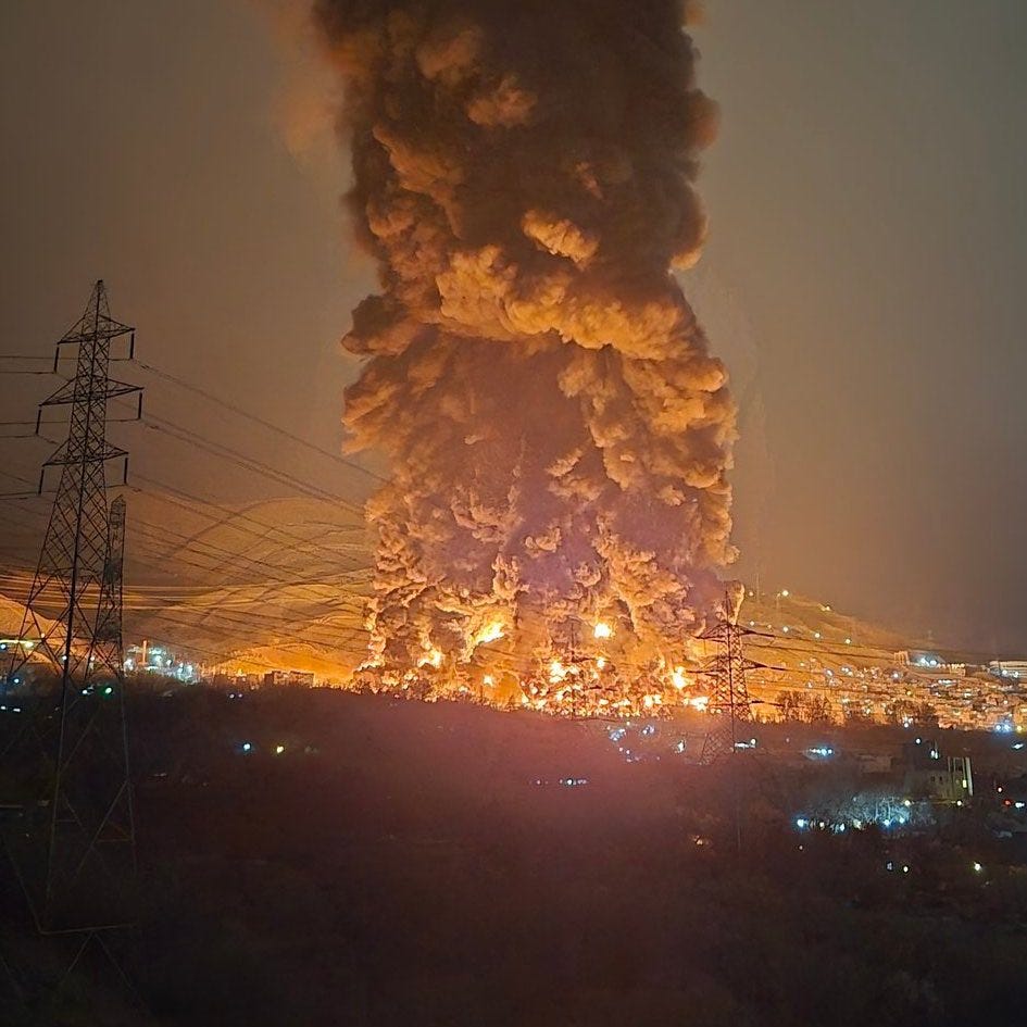 Wretched souls are trapped inside their own homes, as if insects caught in a matrix of terror, due to the flames coming out of the storm drains. Oil from the Shahran depot is leaking into the streets, catching flames; rivers in brilliant reds and yellows quench the trees’ fateful thirst. The city’s veins have been forcefully opened by the master artists of our era, who paint the ground and sky over Tehran the color of a bruise backlit by a furnace. As Iran’s cities turn into labyrinths of death, blaze, and deafening explosions, the one thing left to do is meet doomsday.