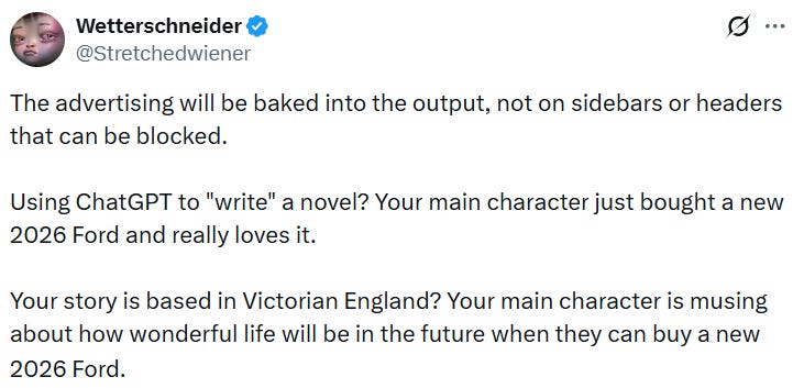 Are companies legally required to disclose the ads? Good luck proving the fact that the main character in your generated fanfiction novel drives a 2026 Ford is an ad. If the model is financially incentivized to favor whatever brand, that bias will be woven into the logic of its output, probably at the post-training level (that is, AI companies will reinforce behaviors into the model that align with the advertiser’s interests, for that is the safest, most reliable way to influence the AI’s behavior and they already do this for other reasons, like steering personality). No one except them has access to the post-training data and it’s not possible to do an “inspection” into the model: its black box nature prevents tracing the source.