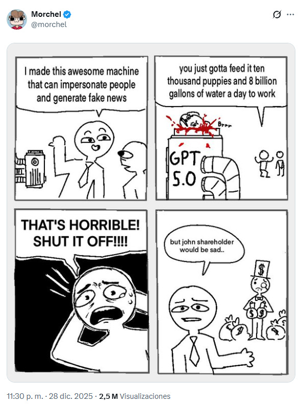 More than copyright breaches, dubious labor practices, and overblown promises, the anger of certain demographics—young people, progressive activists, AI ethics advocates—has converged on the fact that corporations waste so much water (with the sole finality of creating AI models that careless consumers will later use to flood the world in slop) that they may as well cut us access to the canal network or the hydraulic grid outright.