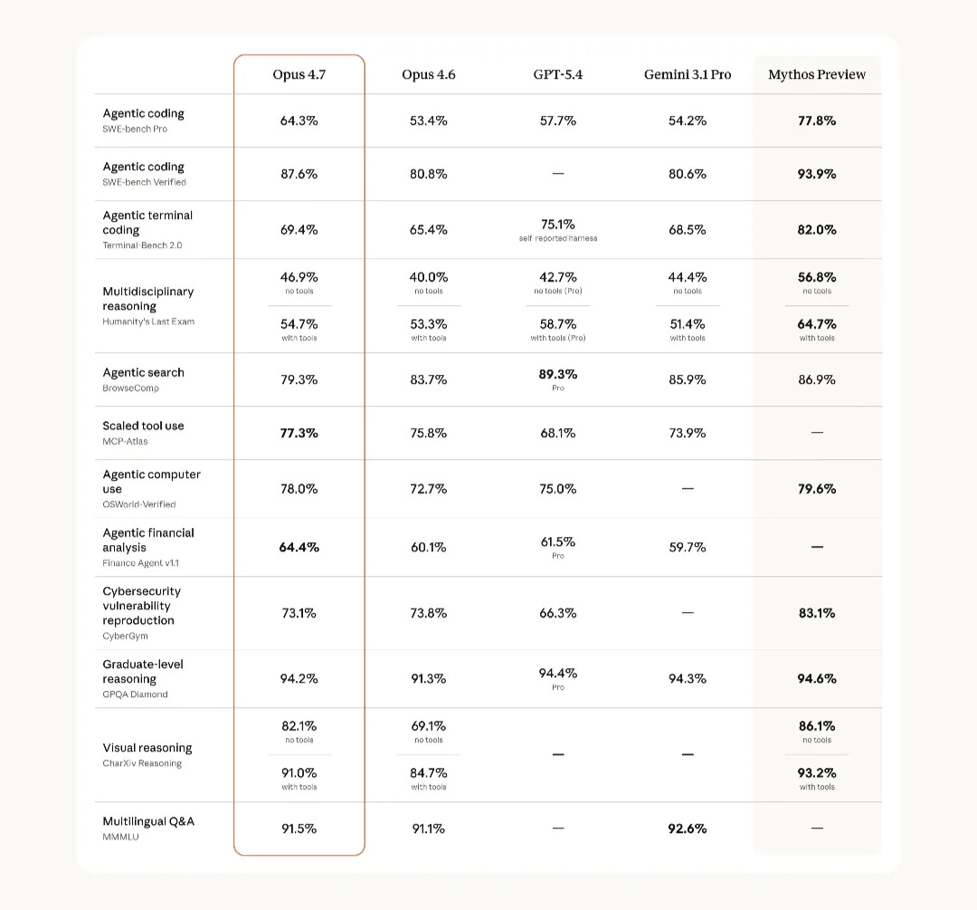 Here’s what Opus 4.7 looks like benchmark-wise: