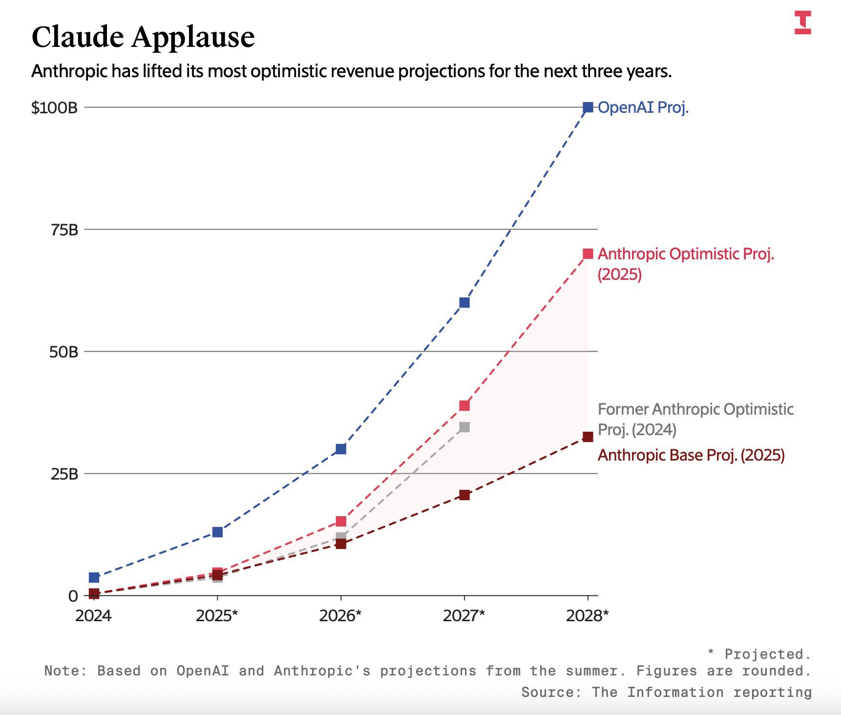 Anthropic is confident in its enterprise growth to the point that it projects profitability by 2028 (optimistically), whereas OpenAI projects it by 2029. If this comes to pass, both would mark unprecedented growth (OpenAI’s revenue projection is higher than Anthropic’s because it serves many more users, so it makes more money but also incurs higher costs). This is how they compare to one another and other tech companies: